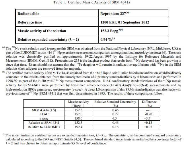 在 2012 年 9 月 1 日美國東部標準時間 1200 的參考時間,經認證的镎 237 質量活度值為:(152.3 ± 1.4) Bq?g-1