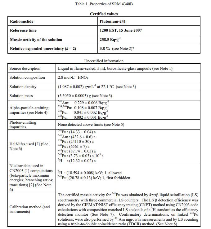 在 2007 年 6 月 15 日美國東部標準時間 1200 的參考時間,經認證的 Plutonium-241 質量活度值為:(258.5 ± 9.8) Bq?g-1