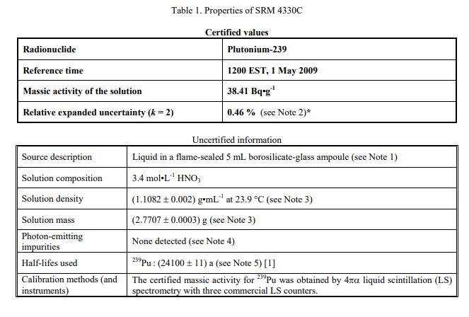 NIST SRM 4330C 钚 239 放射性標準(標準品)表 1 中給出了該 SRM 的其他物理、化學和放射學特性以及標準化方法的詳細信息。認證數量的不確定性已擴大 (k = 2)。不確定度是根據 ISO 和 NIST 指南計算的(見注 2)。表 2 包含構成不確定性分析的組件規范。認證到期: SRM 4330C 的認證無限期有效,前提是 SRM 處理和儲存得當,并且沒有發生蒸發或成分變化。未開封安瓿中的溶液基質在其半衰期依賴的使用壽命內是均質且穩定的,前提是按照本證書中給出的說明處理 SRM(參見“使用說明")。如果 SRM 損壞、污染或以其他方式修改,則認證無效。