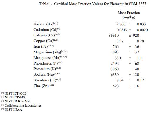表 1 和表 2 提供了 SRM 3233 中元素和維生素的認(rèn)證質(zhì)量分?jǐn)?shù)值,以干質(zhì)量為基礎(chǔ)報(bào)告。NIST 認(rèn)證值是 NIST 對(duì)其準(zhǔn)確性有最高置信度的值因?yàn)樗幸阎蚩梢傻钠?jiàn)來(lái)源都已被調(diào)查或考慮 [1]。價(jià)值分配分析由 NIST 和合作實(shí)驗(yàn)室進(jìn)行。認(rèn)證值計(jì)算為 NIST 方法的平均值、美國(guó)農(nóng)業(yè)部 (USDA) 方法的平均值以及合作實(shí)驗(yàn)室提供的平均結(jié)果的中位數(shù)(如果適用)。所有值在沒(méi)有加權(quán)的情況下合并。相關(guān)的不確定性以 95% 的置信水平表示 [2-4]。