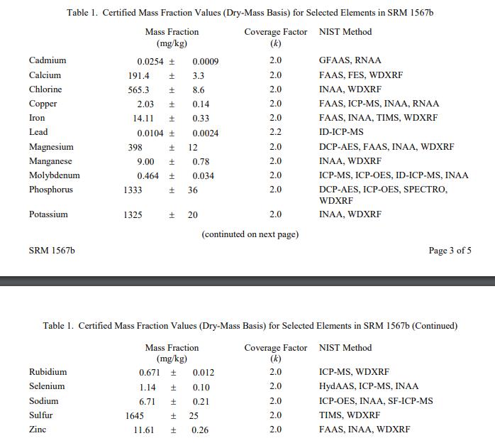 表 1 提供了 SRM 1567b 中選定元素的認證質量分數值。 NIST 認證值是 NIST 對其準確性的最高置信度的值,因為所有已知或可疑的偏差來源都已調查或考慮[1]。以質量分數單位 [2] 以干質量為基礎報告值。